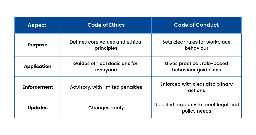 A code of ethics is broad and value-based, outlining principles such as integrity, honesty, and fairness. A Code of Conduct is specific and action-focused, explaining acceptable and unacceptable workplace behaviour.