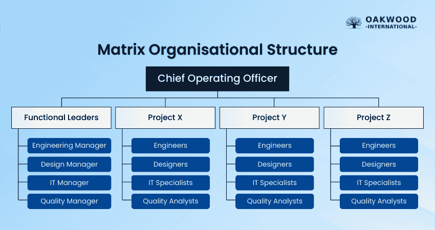 The Matrix Structure integrates both functional and divisional reporting lines. Employees typically report to two leaders, one representing the functional discipline and another overseeing project or product outcomes.