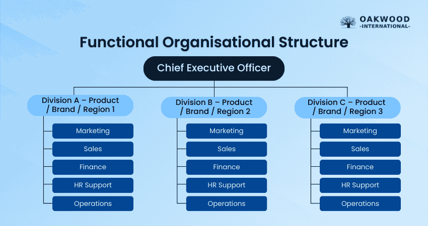 This model groups employees according to their specialised competencies such as Finance, Marketing, Human Resources, and Operations. Authority flows vertically, with Functional Managers exercising control over their respective domains.