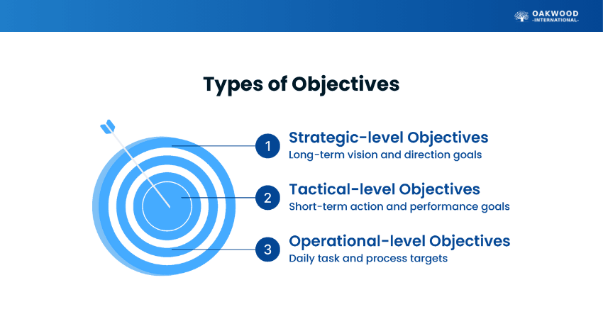 For guidance, planning, and execution, objectives can be set at different levels. Each type focuses on a particular aspect of achieving a Goal. The main types are: