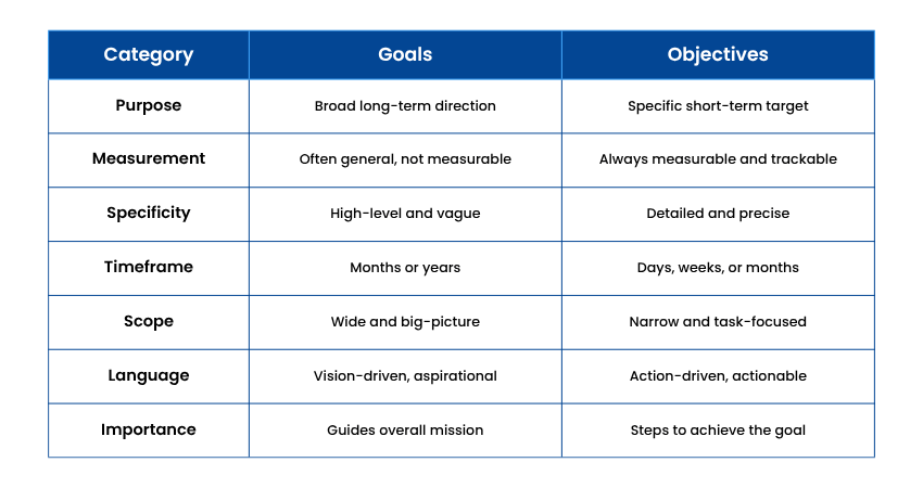 Goals and Objectives turn ideas into results. Goals give direction and purpose, while Objectives create the path by breaking them into measurable steps. Always remember to set SMART Goals to maintain a focused path toward success, keeping you motivated, accountable and improving. A strong Goals vs Objectives framework builds the foundation that transforms ambitions into accomplishments.