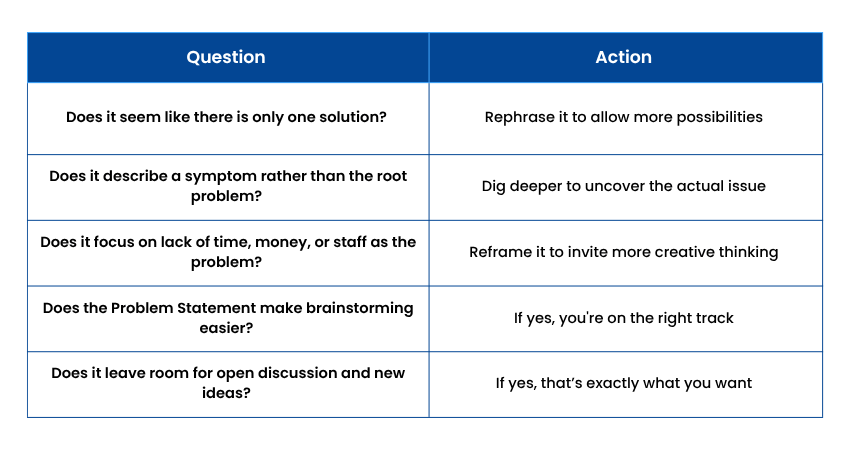 This clear format ensures you capture what, who, why it matters, and what success looks like. By asking the right questions, you make sure the problem is defined in a way that invites better, broader solutions.