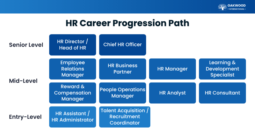 The HR Career Path is no longer strictly linear, as professionals can enter through different routes and grow based on their skills, interests, and experience. It progresses from entry-level to strategic roles, with opportunities to specialise or move across HR functions. These levels can be seen through roles at each stage: