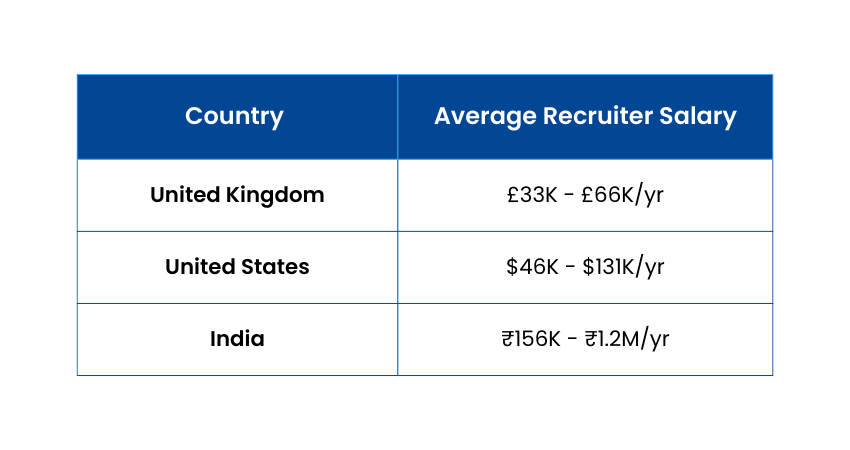 Recruiter salaries vary by experience, location, and role type. The table below compares average Recruiter salaries across countries.