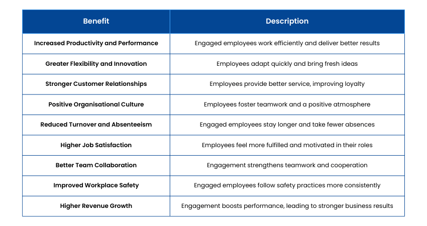 Employee Engagement brings powerful benefits to both employees and organisations. Here are its key benefits: