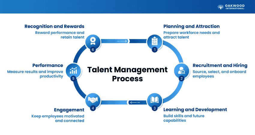 Talent Management is a strategic process that focuses on attracting, developing, engaging, and retaining employees to support an organisation’s goals. It covers the full employee lifecycle, from hiring and onboarding to development and succession planning, ensuring the right people are placed in the right roles.